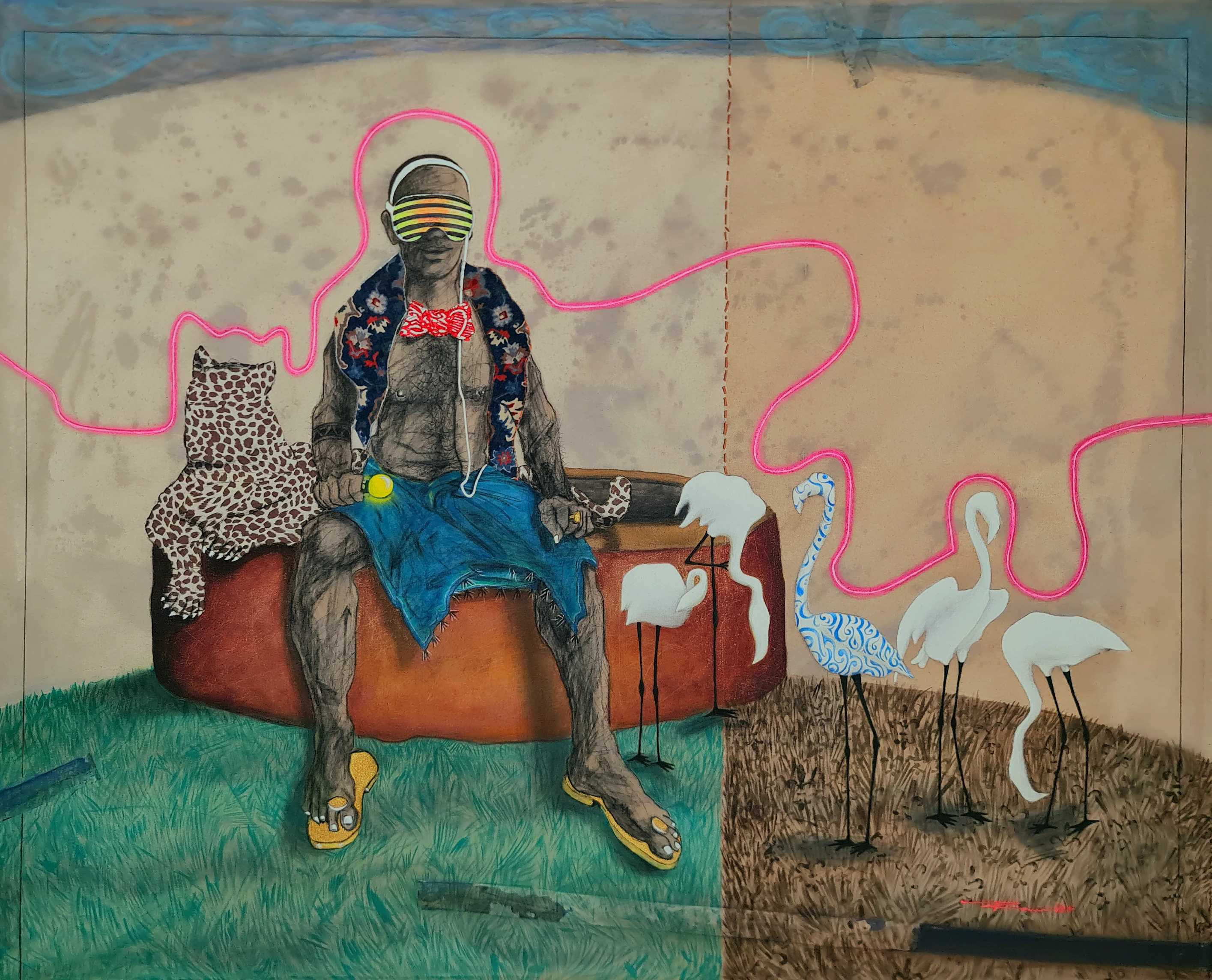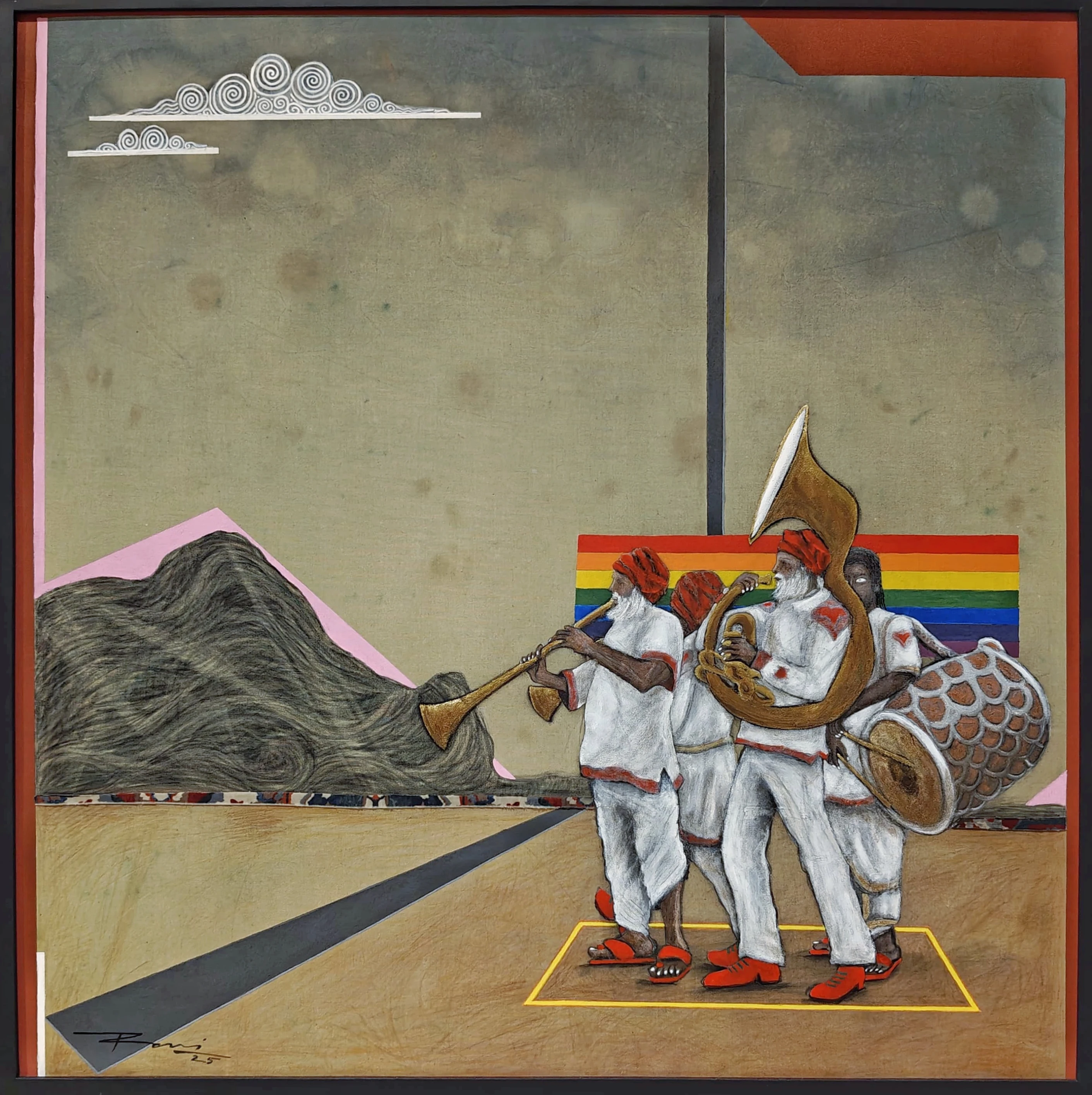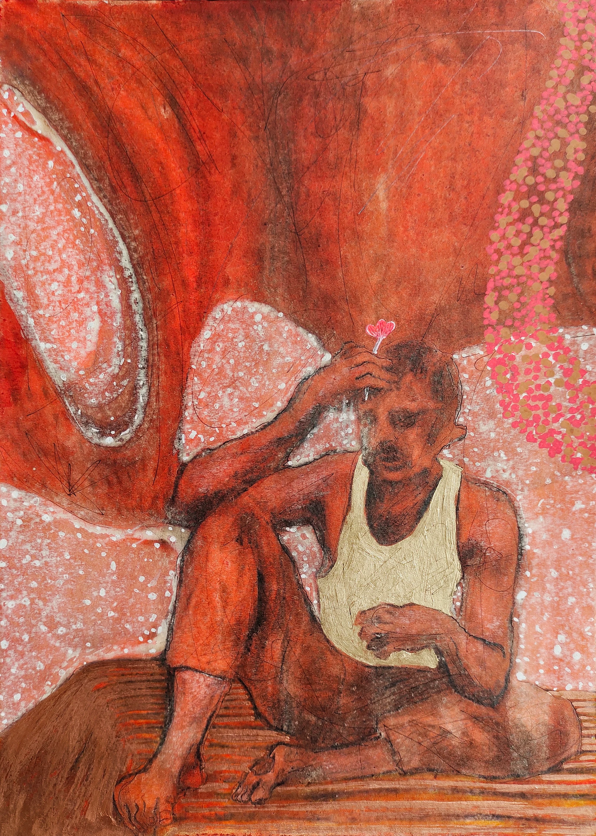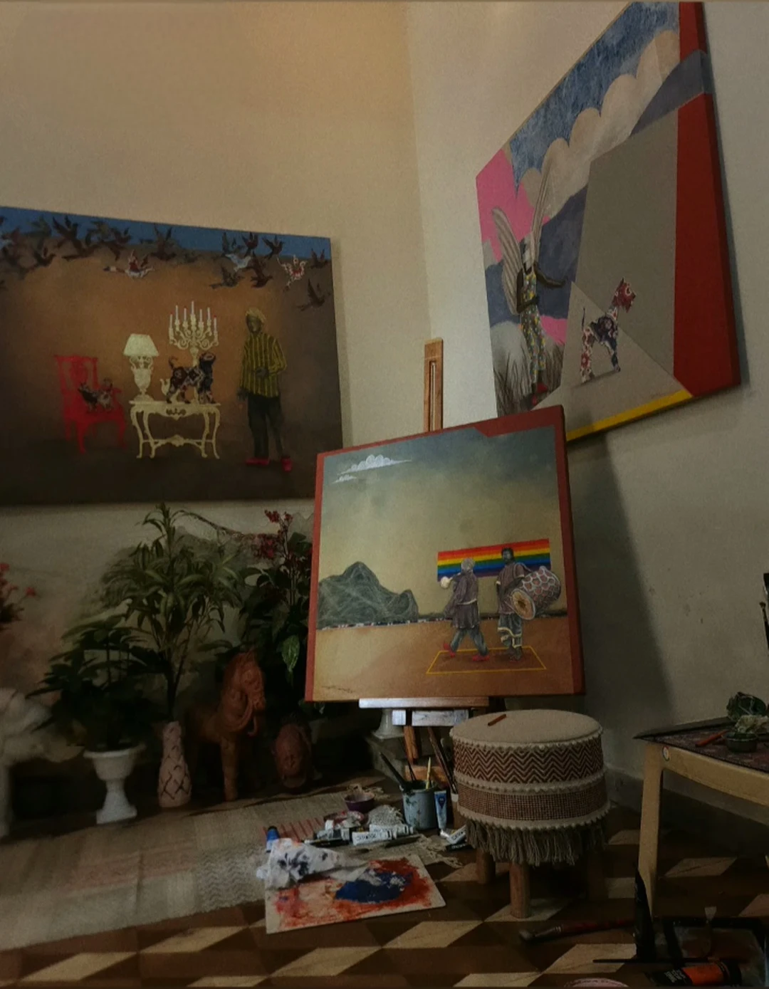 Ravi's work gives equal agency to clouds, wind, animals, and people, treating each element as a character within a larger, living narrative. Through faceless figures, symbolic objects, and dreamlike environments, he constructs layered compositions that evoke presence, memory, and subtle transformation.