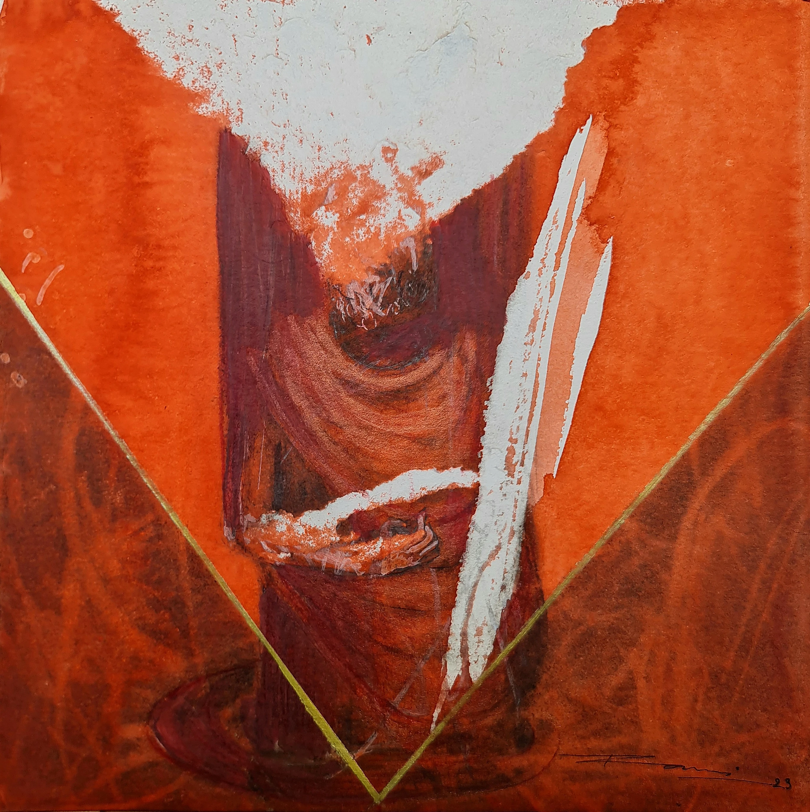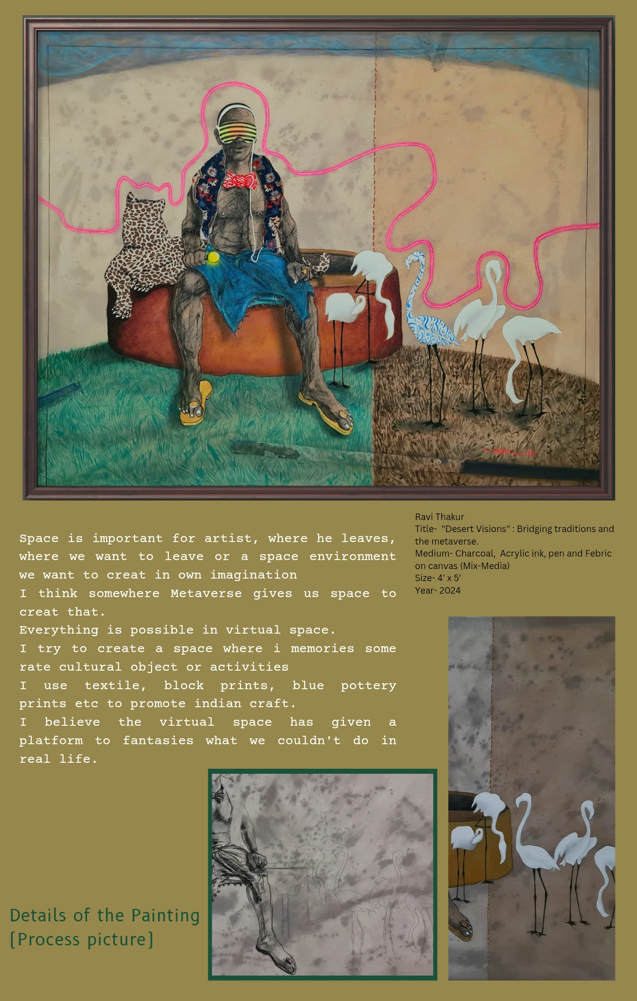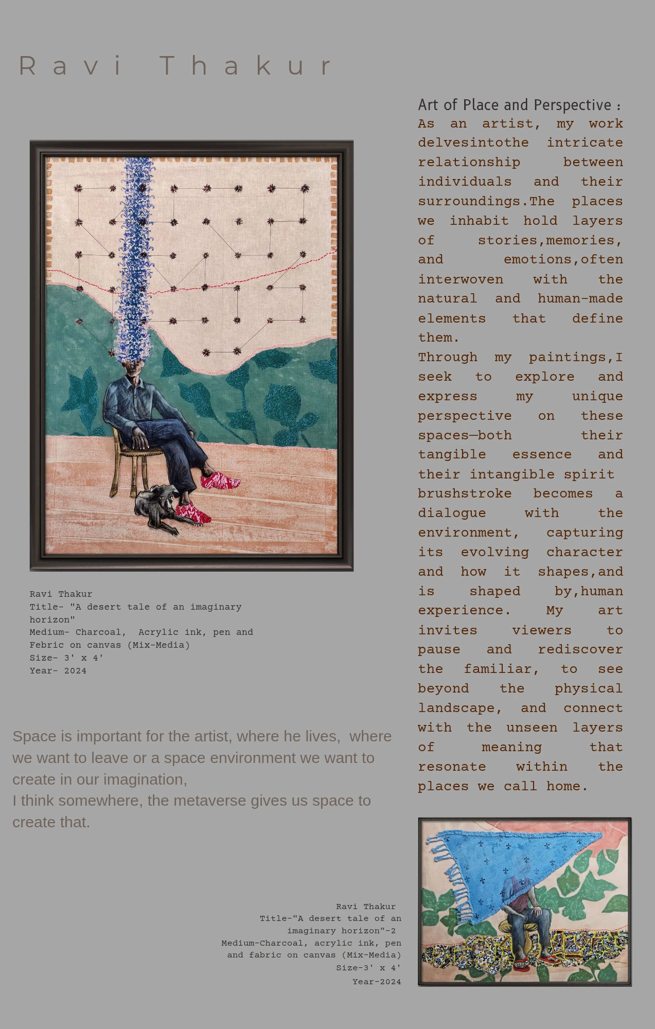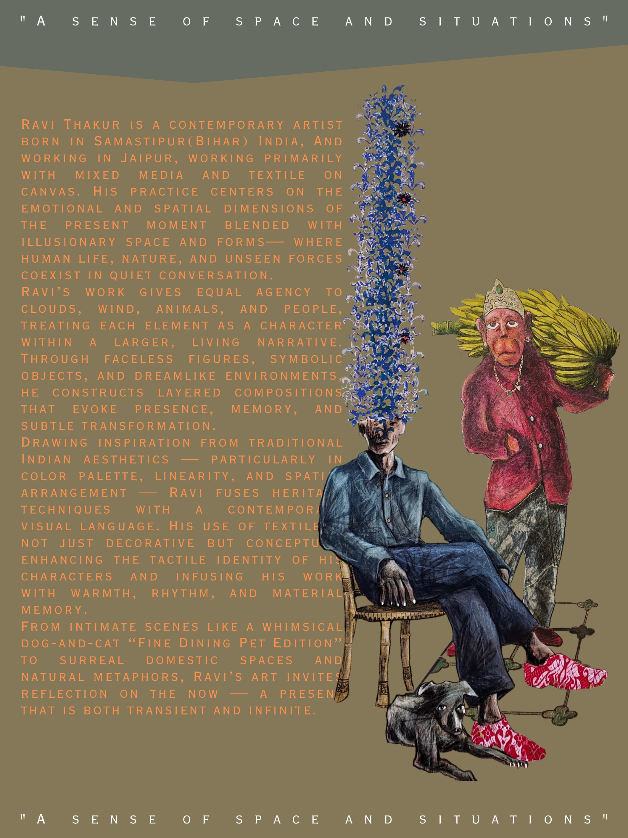 Ravi Thakur is a contemporary artist born in Samastipur(Bihar) India, And working in Jaipur, working primarily with mixed media and textile on canvas. With over 10 years of experience, his practice centers on the emotional and spatial dimensions of the present moment blended with illusionary space and forms- where human life, nature, and unseen forces coexist in quiet conversation.
