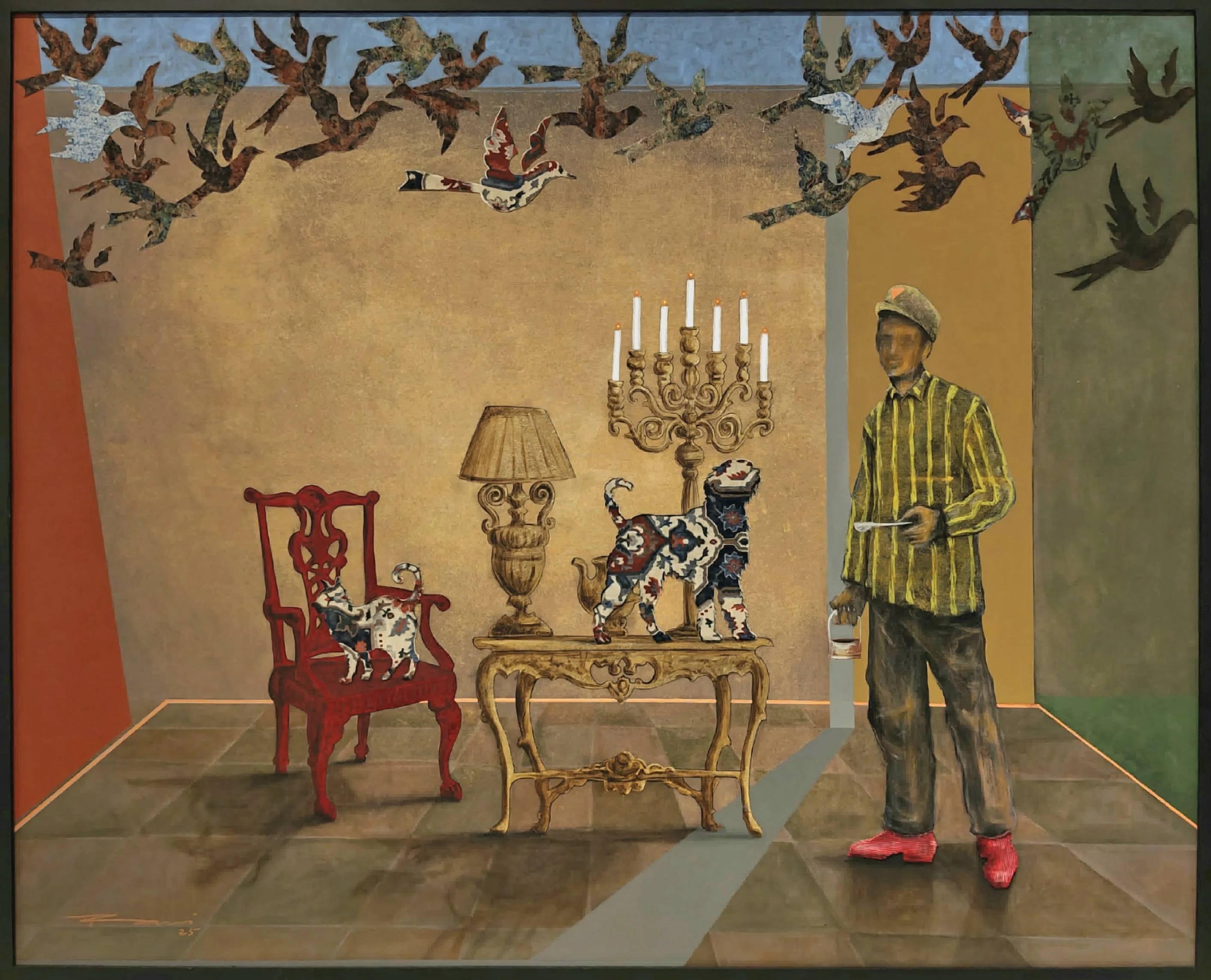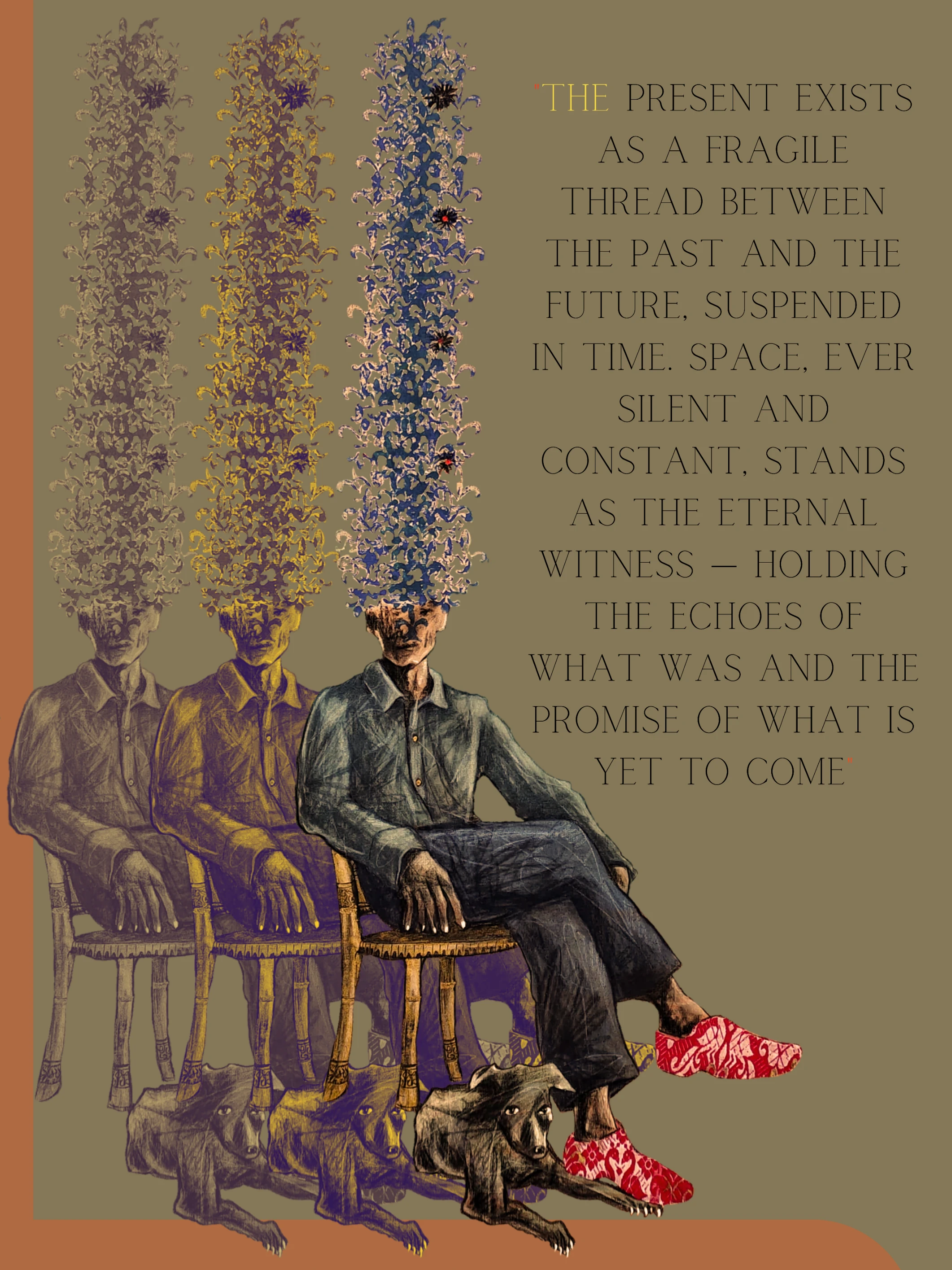 From intimate scenes like a whimsical dog-and-cat "Fine Dining Pet Edition" to surreal domestic spaces and natural metaphors, Ravi's art invites reflection on the now a present that is both transient and infinite.